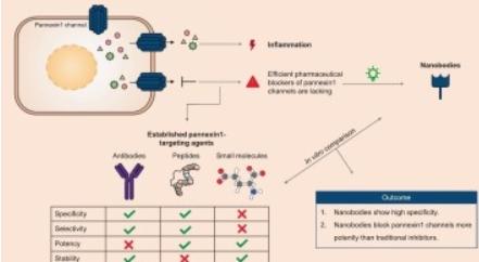 Pannexin1 channels mediate paracrine signaling and have recently emerged as key players in several inflammatory diseases. Although pannexin1 channel inhibition could represent a novel strategy for inflammatory disease treatment, therapeutic pannexin1 channel targeting is impeded by the lack of specific and potent inhibitors. To counteract this, we introduced nanobody-based inhibitors of pannexin1 channels. As previously demonstrated, the pannexin1-targeting nanobodies hold great promise as anti-inflammatory agents, yet this should be further tested. By using an in vitro approach, we continued the evaluation of the nanobodies by comparing their ability to bind and block pannexin1 channel activity with established pannexin1-binding compounds and pannexin1 channel inhibitors, respectively. Nanobodies directed to pannexin1 outperformed tested antibodies in terms of affinity towards human pannexin1 proteins, with their binding capacity being strongly linked to the extracellular loop regions of the pannexin1 protein, in an ELISA-based experimental setup. Moreover, the inhibitory effects of small molecule, peptide and nanobody-based inhibitors of pannexin1 channels were assessed by measurement of extracellular ATP release and intracellular YO-PRO1 uptake. Thus, carbenoxolone, probenecid, 10Panx1 and pannexin1-targeting nanobodies achieved blocking effects by reducing both ATP release and YO-PRO1 uptake. Collectively, the nanobodies show inhibitory effects by using smaller concentrations than traditional pannexin1 channel inhibitors. Therefore, nanobodies offer unique features for the development of pannexin1 channel inhibitors as novel anti-inflammatory therapeutics.
